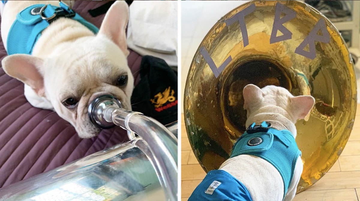 Freddie the Frenchie has a lot to say. Recently when his dad Ryan was warming up on the tuba for a performance with the L Train Brass Band, Freddie couldn’t resist the urge to sass him back!