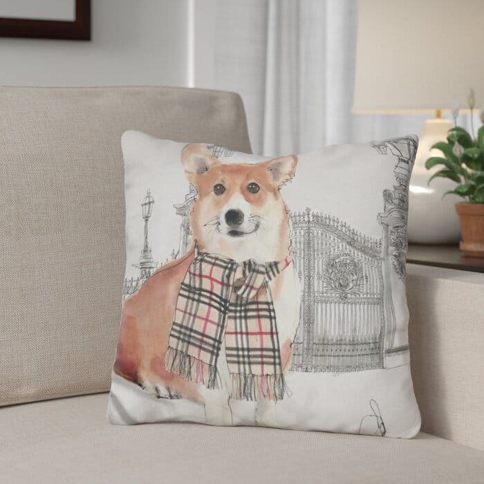 This charming throw pillow features a sophisticated corgi dressed for winter against a very regal scene in a velvety texture. Pillow insert included. Do you think the Queen, famous lover of corgis, would approve?