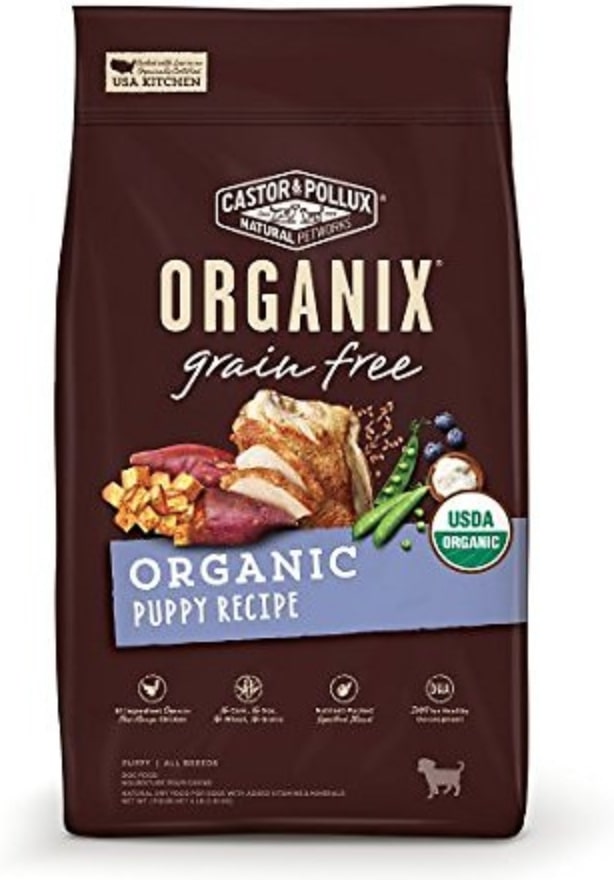 Certified organic and made in the USA, Castor & Pollux’s grain-free puppy recipe contains free-range chicken as its first ingredient.