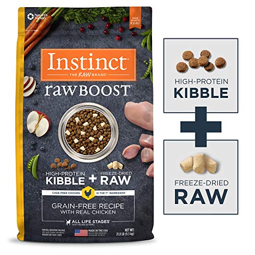 For protein-packed nutrition, this Instinct Raw Boost Recipe is the one to choose. Made with high-protein kibble infused with freeze-dried pieces of raw chicken, this grain-free formula doesn’t contain any corn and it is completely free from by-products and artificial additives.