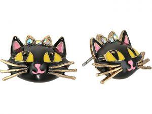 For when you’re feeling a little extra, rock these designer enamel studs showing off a cute black cat face with long gold whiskers and a sparkling rhinestone bow.