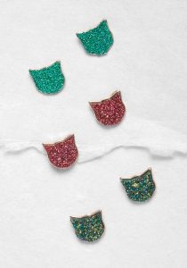 Shine on, pretty kitty, with three different versions of glittery cat-face studs. These metal pairs are perfect for a party or just adding a touch of sparkle to your wardrobe.